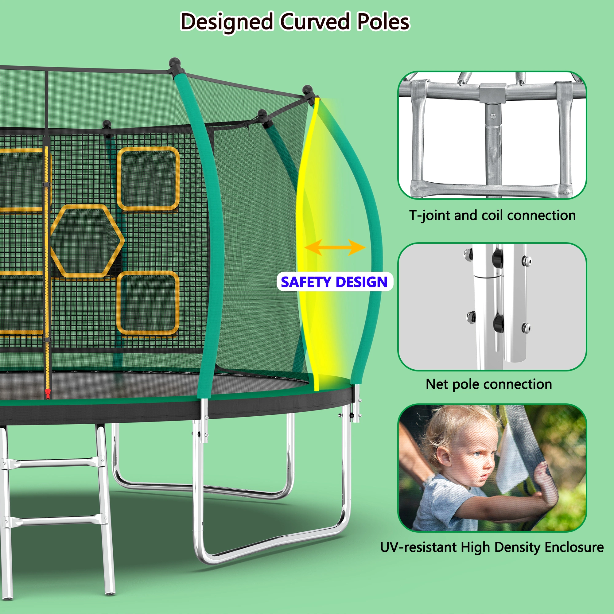 Safety net 360 -degree package, providing a safe, spacious activity spaceWith CURVED POLES, your trampoline has MORE SPACE between kids and the poles for wild bouncing fu